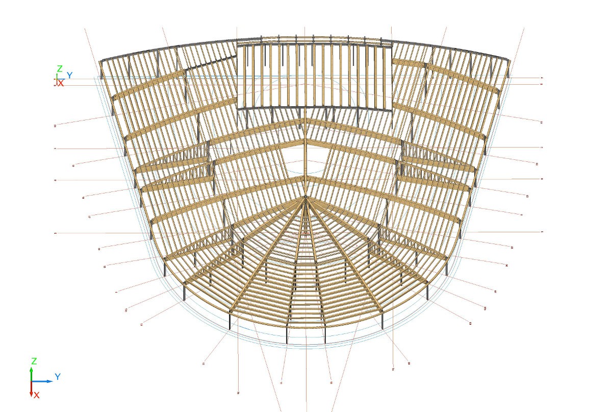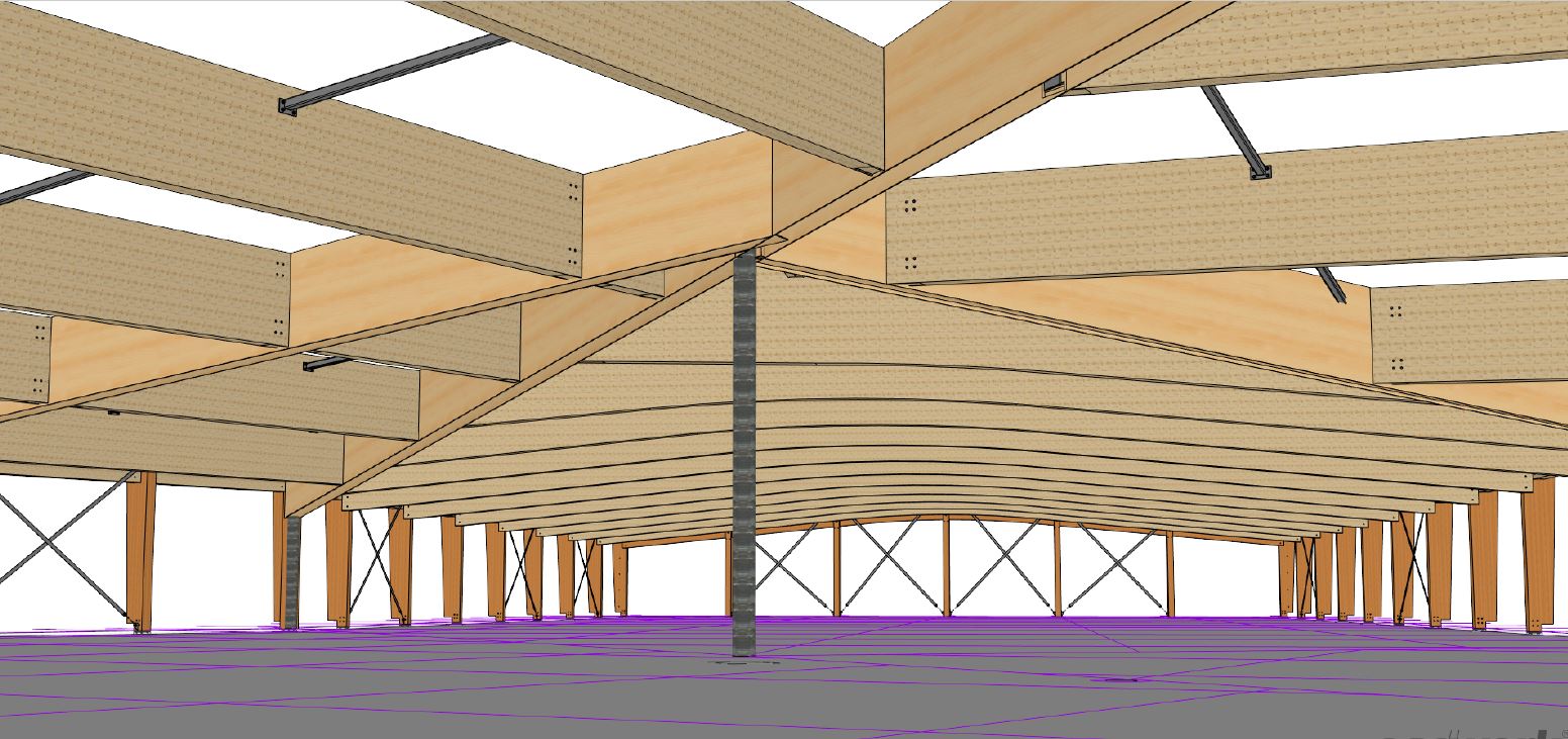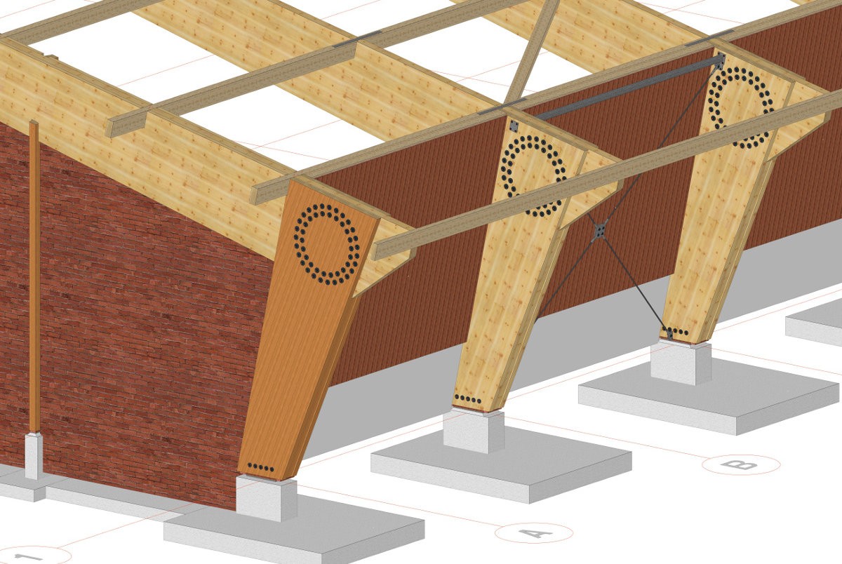 Hierbij is ons 3D constructie model de directe input voor het productieproces. Het resultaat van ons tekenwerk wordt direct ingelezen in de CNC-machine voor de productie van de gelamineerde houtconstructie incl. alle details, stalen bevestigingsmaterialen etc.